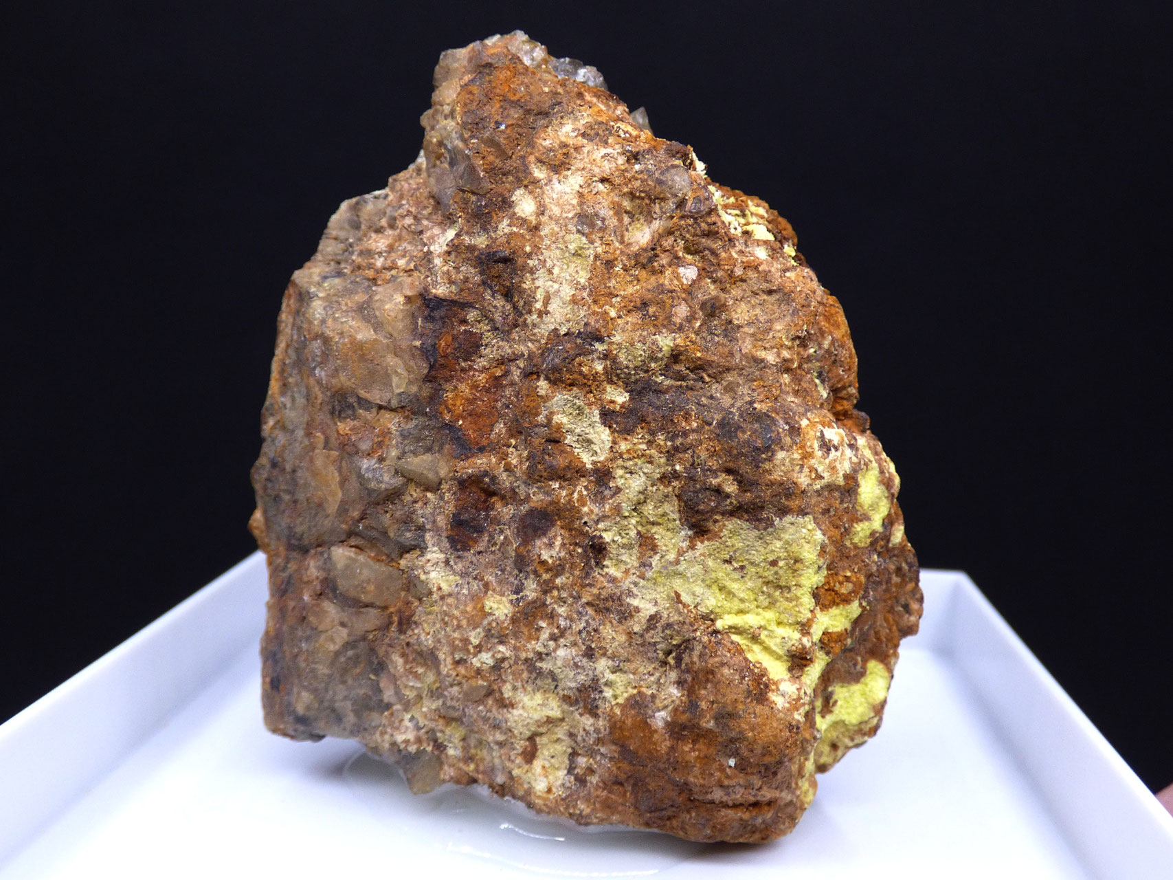 El ejemplar en primer orden esta formado por una clara cristalización de Uranospatita amarilla. Este mineral pierde fácilmente entre 10 y 12 moléculas de agua y se convierte químicamente en Sabugalita dejando la cristalización de la Uranospatita. Actualmente seria una autentica pieza de Sabugalita 100% sin duda, con una impresionante fluorescencia a luz ultravioleta. Tiene mineral salpicado por toda la matriz pero en la parte superior es donde tiene la mayor concentración.
