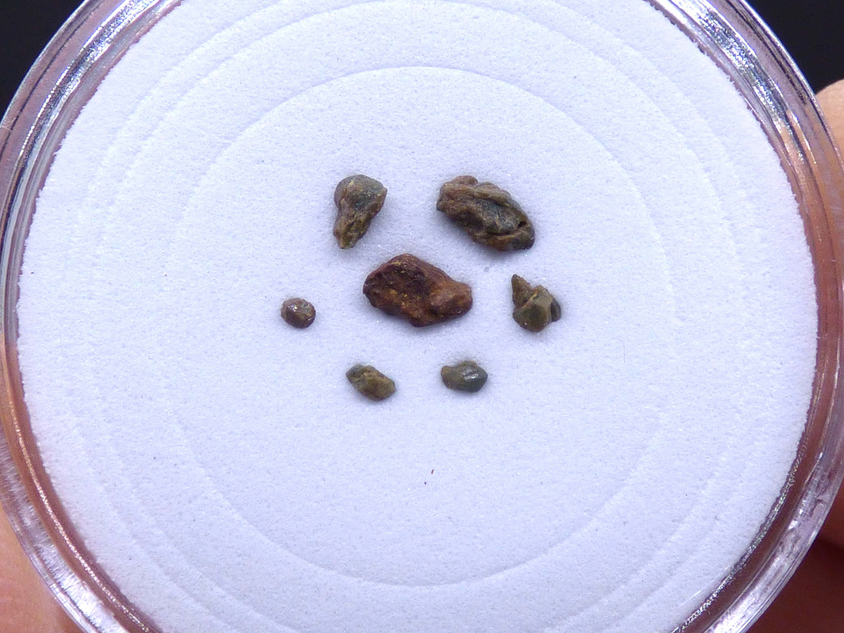 Interesante grupo de ejemplares de Naegita con diferentes formaciones y tonos de color, presentados en una capsula especial para conservarlos y presentarlos.