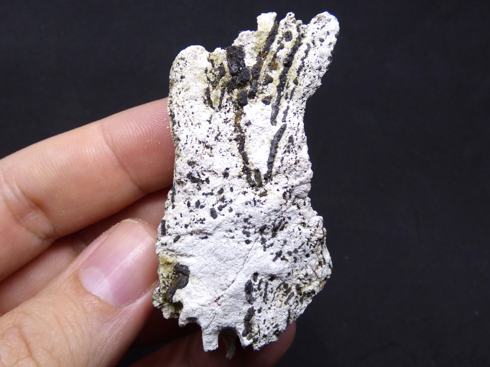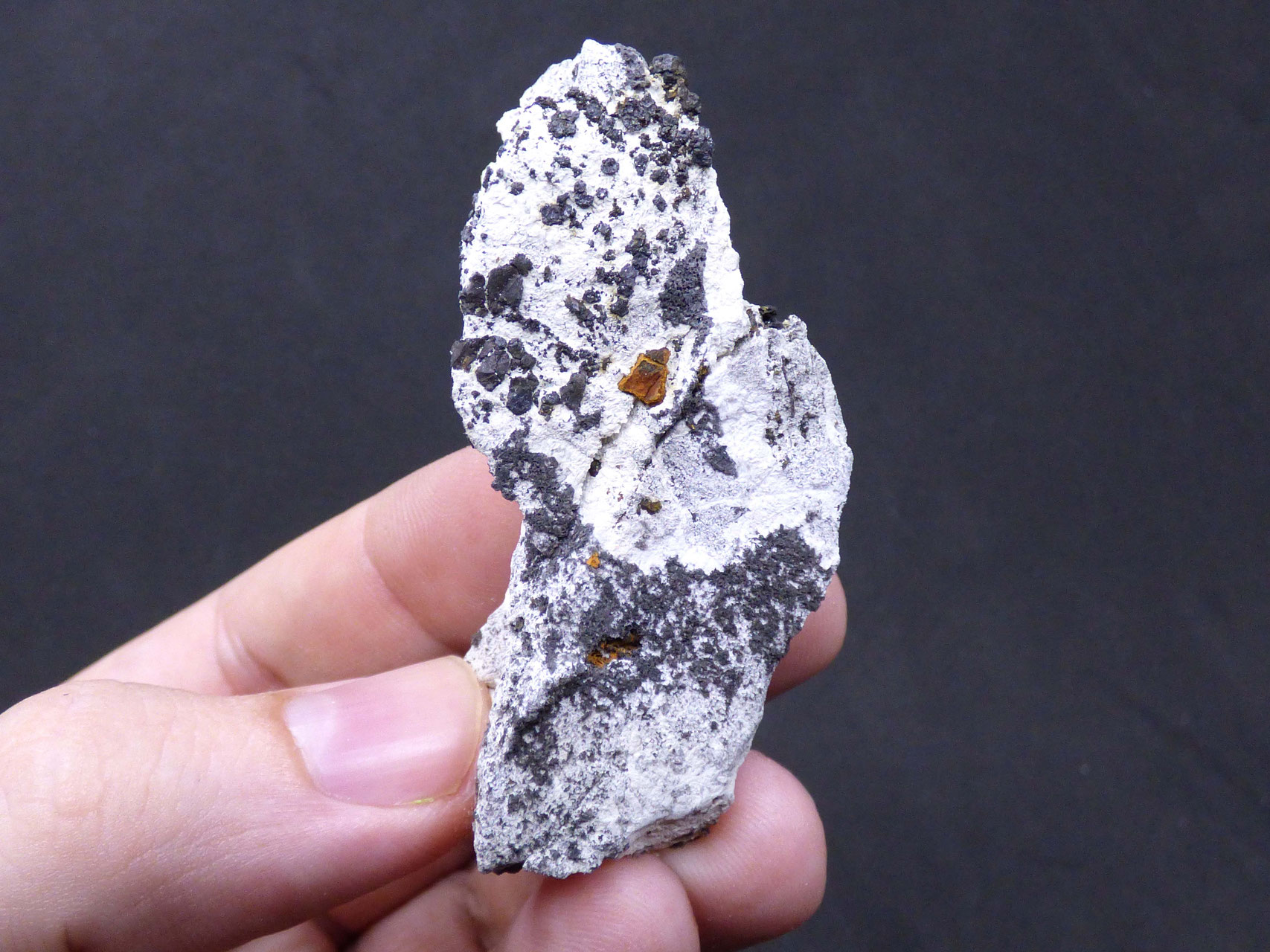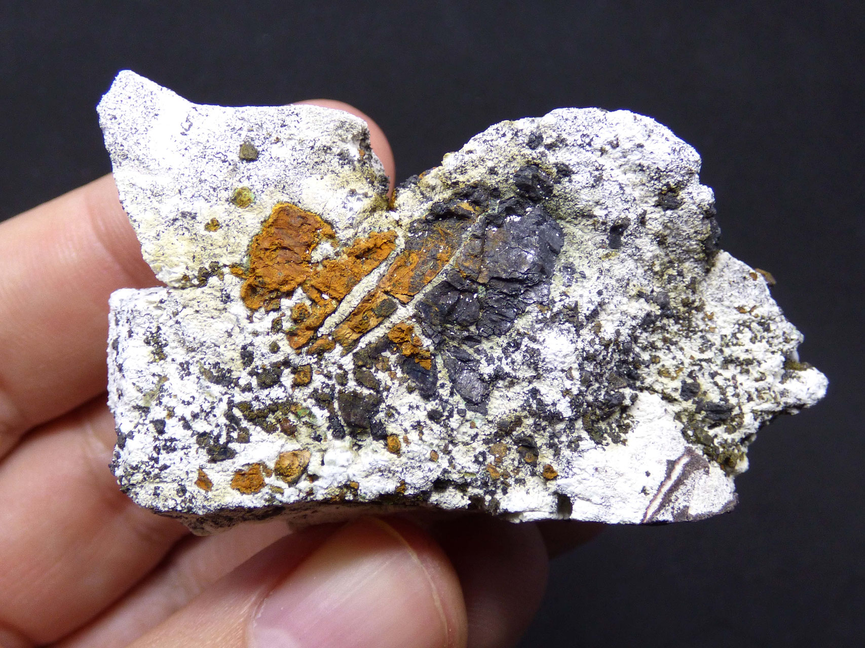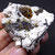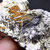 Abundante ejemplar formado por Villamaninita sobre matriz de Calcita blanca, comúnmente asociado a Pirita y Calcopirita con una combinación espectacular.
